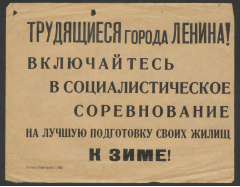 Трудящиеся города Ленина! Включайтесь в социалистическое соревнование на лучшую подготовку своих жилищ к зиме! : [призыв]