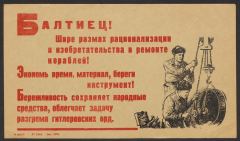 Балтиец! Шире размах рационализации и изобретательства в ремонте кораблей! Экономь время, материал, береги инструмент! Бережливость сохраняет народные средства, облегчает задачу разгрома гитлеровских орд : [призыв]