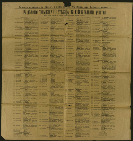 Разделение Томского уезда на избирательные участки : [листовка] / Томская окружная по делам о выборах в Учредительное Собрание комиссия