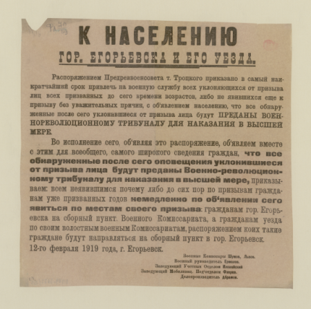 К населению гор. Егорьевска и его уезда. "Распоряжением предреввоенсовета т. Троцкого приказано в самый наикратчайший срок привлечь на военную службу всех уклонившихся от призыва лиц..." 12 февраля 1919 г., г. Егорьевск : [листовка / Егорьевский уезд. комиссариат по военным делам]