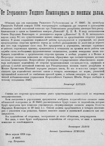 "Объявляю при сем телеграмму Рязанского губвоенкома за № 33487...": [О порядке предоставления рабочим и служащим государственных учреждений и предприятий временных отсрочек от военного призыва, 29-го апр. 1919 г. № 4107, г. Егорьевск : листовка]