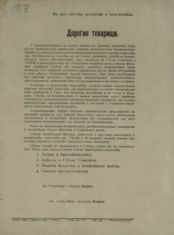 Во все укомы, волкомы и комячейки. "Дорогие товарищи. С середины февраля до начала марта... будут повсеместно проведены широкие крестьянские конференции..." : [листовка / Рязанский губ. комитет РКП(б)]