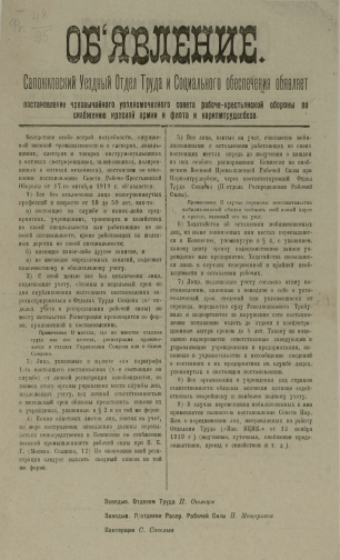 Приводится текст Постановления чрезвычайного уполномоченного Совета рабоче-крестьянской обороны по снабжению Красной армии и флота и Наркомтрудсобеза о трудовой мобилизации слесарей, токарей, лекальщиков и инструментальщиков
