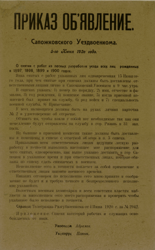 Приказ-объявление Сапожковского уездвоенкома, 5-го июня 1920 г.: "О снятии с работ из лесных разработок уезда всех лиц, рожденных с 1897, 1898 и 1899 и 1900 годах" : [листовка / Сапожковский уезд. комиссариат по военным делам, Военно-революционный совет и другие органы управления]