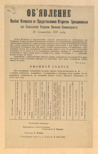 Объявление Особой комиссии по предоставлению отсрочек призываемым при Самарском уездном военном комиссариате, 26 сент. 1919 г. : [о порядке оформления отсрочек; листовка / Самарская уезд. комиссия по отсрочкам]