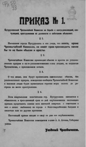 Приказ № 1 Бугурусланской чрезвычайной комисси по борьбе с контрреволюцией, спекуляцией, преступлениями по должности и саботажем...: [О борьбе с самовольными обысками и арестами : листовка / Бугурусланская уезд. чрезвычайная комиссия по борьбе с контрреволюцией, саботажем, спекуляцией и преступлениями по должности]