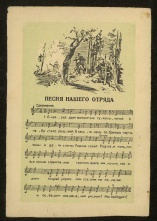 Песня нашего отряда [Изоматериал] : Окрасил дым волнистые туманы, ночное небо стало розовей ...; почтовая карточка / рис. Ю. Петрова ; муз. П. Рукина ; текст партизана В. ; ред.: М. Матвеев
