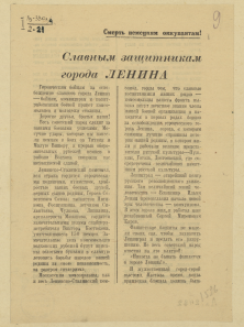 Язык: русский.Выходные данные: [Москва : б. и., 1942]Физическая характеристика: 2 с. ; 21х15 см.Серия: Смерть немецким оккупантам! Примечания: В конце текста подписи: Секретари МК и МГК ВЛКСМ: Пегов, Морозов, Красавченко, Федорова, Буданова, Воинова, Сизов.Предметная рубрика - Тема: Блокада Ленинграда -- 1941 - 1944 -- ЛистовкиДругие классификации: Т3(2)722.721,011Коллекции Электронной библиотеки: Листовки -- Листовки блокадного Ленинграда ; Ленинград в Великой Отечественной войне -- Листовки блокадного ЛенинградаКоллекция: Библиография Победы ; Национальная библиографияОнлайн доступ: Электронная копия ; Электронная копия ; Электронная копия Тип экземпляра: Визуальный материалНет реальных экземпляров для этой записи