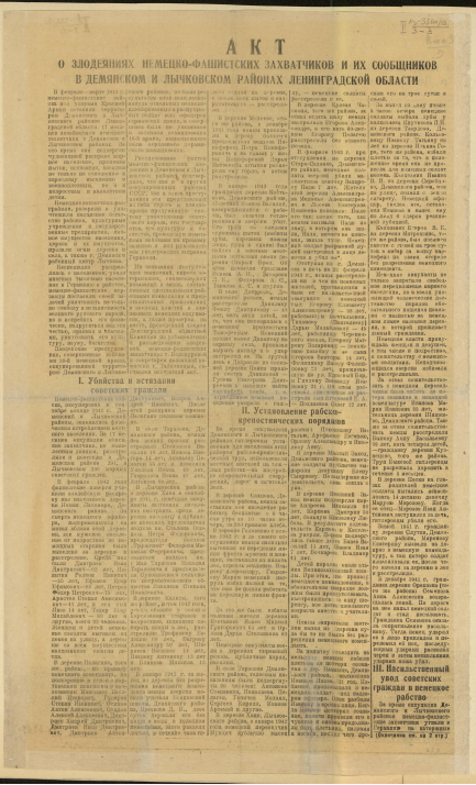 Акт о злодеяниях немецко-фашистских захватчиков и их сообщников в Демянском и Лычковском районах Ленинградской области, 29 июня 1943 г.
