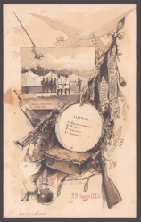 Рисунок с изображением полкового лагеря на фоне двуглавного орла; оружие, воинская амуниция, знамена, барабан и духовые музыкальные инструменты