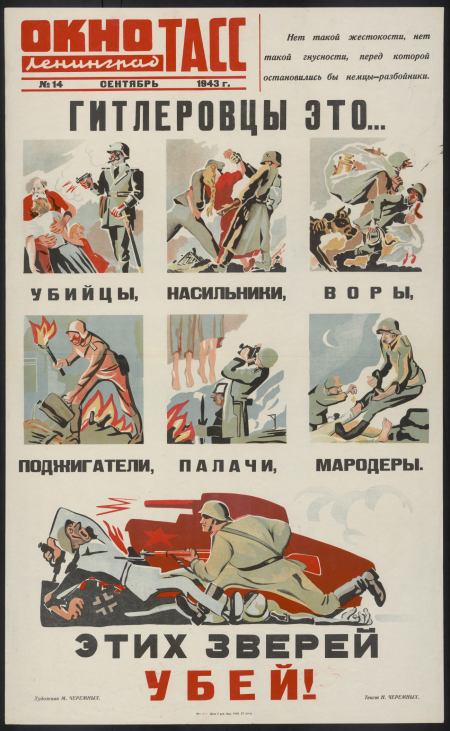 Гитлеровцы это... убийцы, насильники, воры, поджигатели, палачи, мародеры. Этих зверей убей! [Изоматериал] : Нет такой жестокости, нет такой гнусности, перед которой остановились бы немцы-разбойники; [плакат] / художник М. Черемных ; текст Н. Черемных