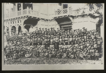 Заведующий Сергиевской школой трезвости иеромонах Павел (Горшков), командир лейб-гвардии Семеновского полка генерал-майор Е. Ф. Новицкий и другие представители полка, мальчики - "семеновские потешные" на фоне здания