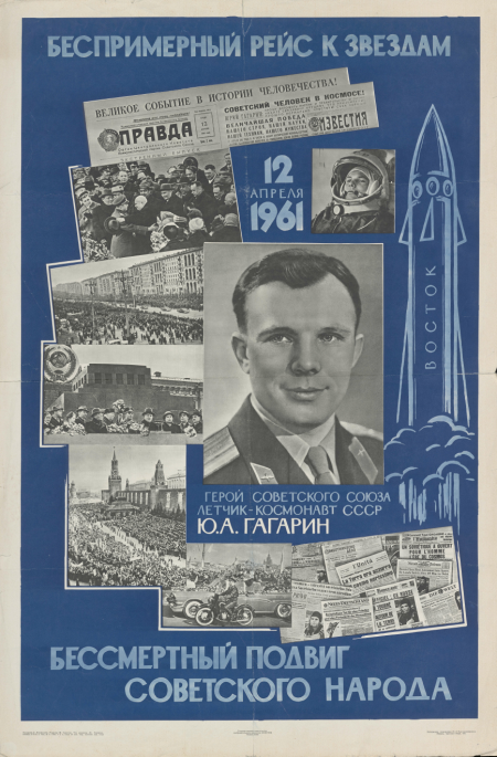Беспримерный рейс к звездам 12 апреля 1961 : бессмертный подвиг советского народа; герой Советского союза летчик-космонавт СССР Ю. А. Гагарин; [плакат] / художник К. Мистакиди ; редактор М. Сергеева ; тех. редактор Ж. Чертова