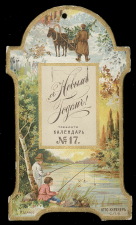 В центре место для прикрепления отрывного календаря; вверху запряженная в сани лошадь и крестьянин с елкой в зимнем лесу, внизу крестьянские дети, рыбачащие на берегу