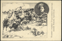 Сражение с участием Козьмы Крючкова; в правом верхнем углу в круглом медальоне портрет Козьмы Крючкова: погрудный, 3/4 влево, в военной форме