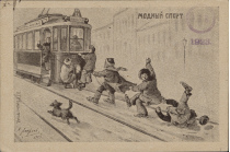 Трамвай, за которым едут коньках три мальчика, держась за прикрепленную к трамваю веревку, рядом бежит собака; два других мальчика едут на трамвайной "колбасе"; детям грозит из трамвая женщина-кондуктор