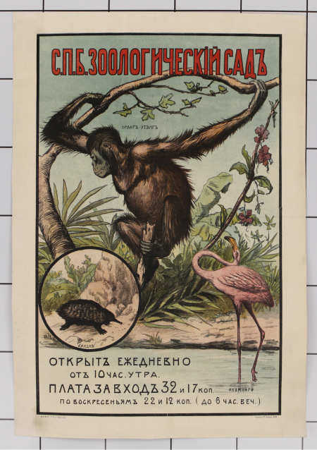 С.П.Б. Зоологический сад : открыт ежедневно от 10 час. утра. Плата за вход 32 и 17 коп. По воскресеньям 22 и 12 коп. (до 6 час. вечера); оранг-утанг, ехидна, фламинго; [плакат]
