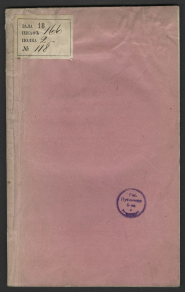 Экз. РНБ (18.166.2.118) в обл. из розовой бумаги. На 1-й с. обл. ярлык с шифром РНБ. На 2-й с. обл. пустой ярлык. На 1-й с. обл., на тит. л., с.3, 15, 33 и 48 круглый штамп ГПБ. Размер: 19,5х12,0х0,4 см NLR: 18.166.2.118