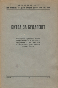 Битва за Будапешт : Стенограмма публичной лекции ген.-майора Н. И. Беляева, прочит. 12-го мая 1945 г. в Центр. доме Красной Армии в Москве / Лекц. бюро при Ком-те по делам высш. школы при СНК СССР