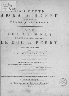 КнигаНа смерть дюка де Берри. / Сочинение графа Д. Хвостова.Хвостов, Дмитрий Иванович (1757-1835)1821Наличие: Экземпляры доступные для заказа: РНБ (Садовая)Шифр хранения: 38.22.9.49(28) (1), РНБ (Московский)Шифр хранения: Мф К1/34807-28 (1).