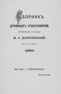НотыСборник духовных стихотворений [Ноты] : (на 3 и 4 голоса) [a cappella] / положенных на музыку М. А. ДанилевскойДанилевская, Мария Андреевна, Композитор [1911]Наличие: Экземпляры доступные для заказа: РНБ (Московский)Шифр хранения: 270-3/257 270-3/257 (1).