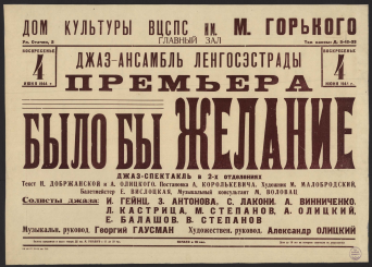 Визуальный материалКонцерт, март 1944 г., 19 воскресенье : участвуют: Артисты Московского орденов Ленина и Трудового Красного Знамени Художественного Академического театра Союза ССР имени М. Горького: Народный артист СССР, лауреат Сталинской премии В. И. Качалов, Народная артистка РСФСР О. Н. Андровская, Народная артистка РСФСР К. Н. Еланская, Народный артист СССР, лауреат Сталинской премии В. Н. Ливанов, Заслуженный артист РСФСР М. М. Яншин, Заслуженный артист РСФСР С. Г. Яров, артисты: И. П. Гошева и С. А. Бутюгин, артисты Музыкального театра имени Народных артистов СССР К. С. Станиславского и В. И. Немировича-Данченко: Народная артистка РСФСР Н. Ф. Кемарская, Заслуженный артист РСФСР Н. И. Тимченко : [афиша] / Управление по делам искусств Исполкома Ленгорсовета, Театральный зал Малого Оперного театраЛенинградский малый театр оперы и балета 1944Онлайн доступ:Электронная копия Наличие: Click here to access online | :
