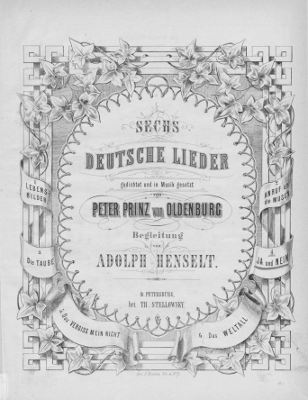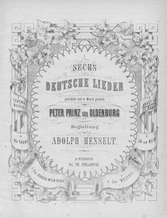 НотыLebens Bilder [Ноты] : "Bilder der Nacht..." : [für eine Singstimme mit Begleitung des Pianoforte] / gedichtet und in Musik gesetzt von Peter Prinz von OldenburgОльденбургский, Петр Георгиевич (принц ; 1812-1881), Композитор ценз. 1875Наличие: Экземпляры доступные для заказа: РНБ (Московский)Шифр хранения: 235-4/3258 235-4/3258 (1).