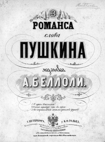 3 романса [Ноты] : canto [e] piano / музыка А. Беллоли ; слова ПушкинаБеллоли, А. (19 в.) -- Композитор ценз. 1862Наличие: Экземпляры доступные для заказа: РНБ (Московский)Шифр хранения: 235-4/1515 235-4/1515 (1).