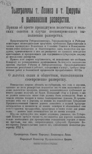 КнигаТелеграммы т. Ленина и т. Цюрупы о выполнении разверстки : [листовка][1919]Наличие: Экземпляры доступные для заказа: РНБ (Садовая)Шифр хранения: ФЛ 5/167 (2).