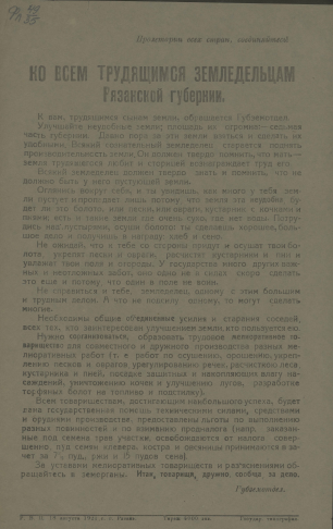 Ко всем трудящимся земледельцам Рязанской губернии. "К вам, трудящимся сынам земли, обращается Губземотдел..." : [листовка]