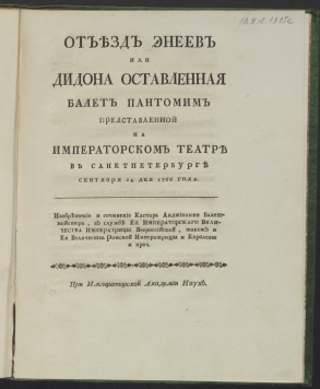 КнигаАнтигон, : сокращенная Метастазиева опера, : представленная на императорском придворном театре, по случаю торжественнаго дня коронации ея императорскаго величества Екатерины II. Самодержицы всероссийския. Сентября 22 дня, 1770 года. : Машины изобретения господина Бригонци, машиниста театральнаго. : Платье изобретения господина Женара, театральнаго портнаго. / Стихотворство господина Метастазиа. ; Музыка господина Томаса Траета, неаполитанца, капельмейстера ея императорскаго величества.Метастазио, Пьетро Доменико (1698-1782), Автор 1770Онлайн доступ:Электронная копия Наличие: