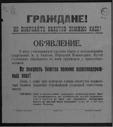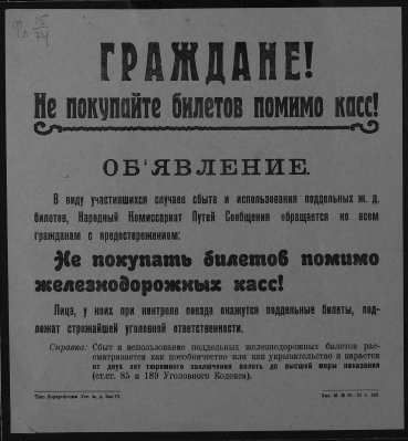 КнигаГраждане, не покупайте билетов помимо касс : Объявление : [листовка][1923]Наличие: Экземпляры доступные для заказа: РНБ (Садовая)Шифр хранения: ФЛ 15/74 (1).