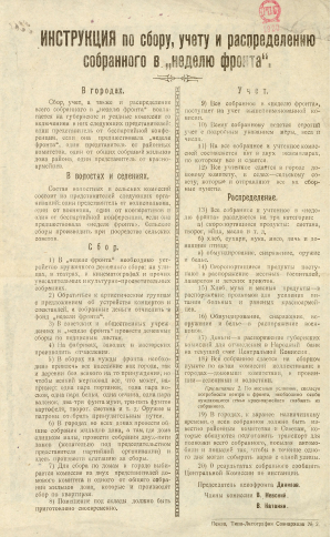 КнигаИнструкция по сбору, учету и распределению собранного в "Неделю фронта" : [листовка][1920, янв.]Наличие: Экземпляры доступные для заказа: РНБ (Садовая)Шифр хранения: ФЛ 11/25 (1).