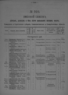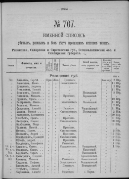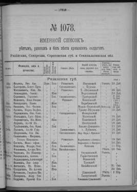 КнигаИменной список убитым, раненым и без вести пропавшим нижним чинам, [1914-1917]. № 182, Черниговская губерния, Приморская обл., Псковская, Радомская, Рязанская, Самарская и Саратовская губернии, Семипалатинская обл., Симбирская и Смоленская губернии[191-?]Наличие: