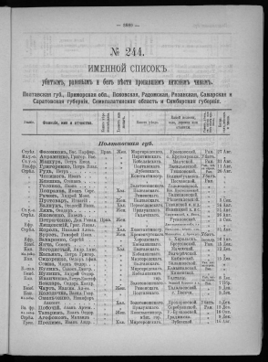 КнигаИменной список убитым, раненым и без вести пропавшим нижним чинам, [1914-1917]. № 195, Подольская, Полтавская, Псковская, Радомская, Рязанская, Самарская и Саратовская губернии, Семипалатинская и Семиреченская обл., Симбирсая и Смоленская губернии[191-?]Наличие:
