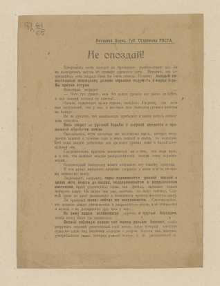 Не опоздай! : листовка Цариц. губ. отделения Роста / [Российское телеграфное агентство, Царицынское губ. отделение]