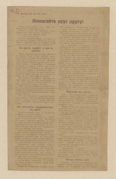 Помогайте друг другу! "Весна не за горами. У всех одна большая забота - о весеннем посеве..." : листовка Цар. губ. отд. Роста / [Российское телеграфное агентство, Царицынское губ. отделение]