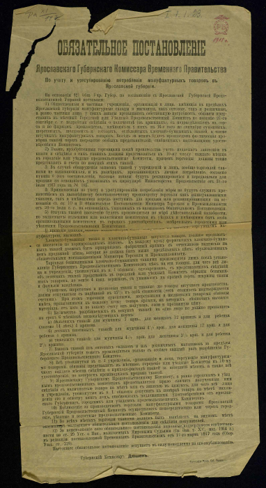 Обязательное постановление Ярославского губернского комиссара Временного правительства по учету и урегулированию потребления мануфактурных товаров в Ярославской губернии : [листовка]