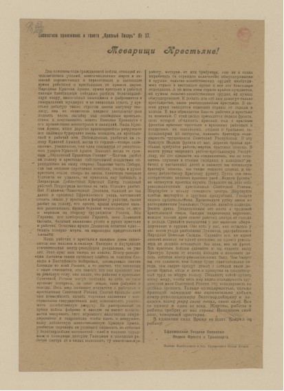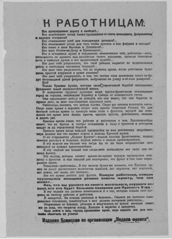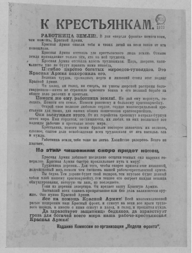 КнигаК крестьянкам. "Работница земли! В дни "Недели фронта" помоги всем, чем можешь, Красной Армии..." : [листовка][1920, янв.]Наличие: Экземпляры доступные для заказа: РНБ (Садовая)Шифр хранения: ФЛ 1/188 (1).