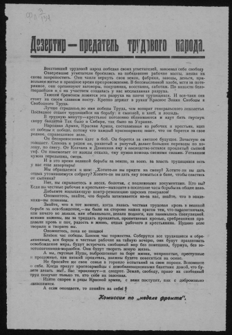 КнигаДезертир - предатель трудового народа : [листовка]1920, янв.]Наличие: Экземпляры доступные для заказа: РНБ (Садовая)Шифр хранения: ФЛ 3/134 (3).