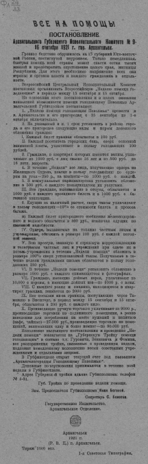 КнигаВсе на помощь! Постановление Арханг. губ. испол. ком. № 9, 16 сент., 1921 г., г. Архангельск : [листовка]1921, сент.Наличие: Экземпляры доступные для заказа: РНБ (Садовая)Шифр хранения: ФЛ 24/33 (1).