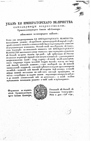 - Из Государственнои Камор коллегии Главнаго магистрата, Московских полицимеистерскои и губернскои канцеляреи, объявляется во всенародное известие (7)