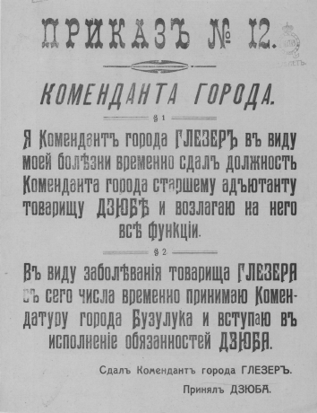 Приказ № 12 Коменданта города. "§ 1. Я Комендант города Глезер... временно сдал должность Коменданта города..." : [листовка]