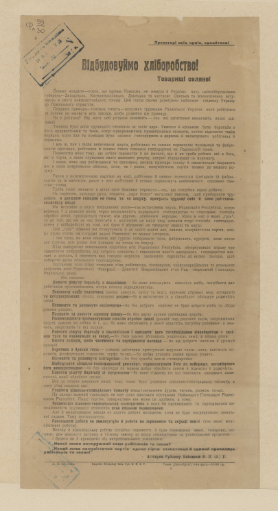 Восстановим земледелие! : [листовка] / Киевская губерния. Киевская организация КП (б) Украины