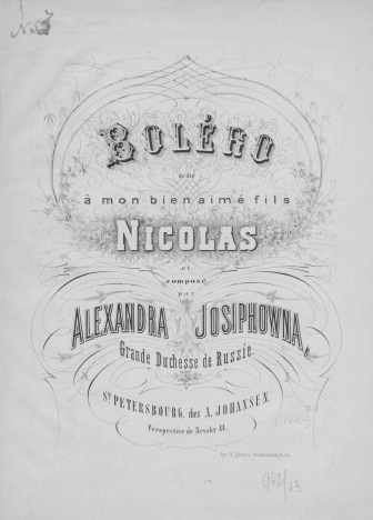 НотыBoléro [Ноты] : [pour piano à 4 mains] / dédié à mon bien aimé fils Nicolas et composé par Alexandra Josiphowna, Grande Duchesse de RussieАлександра Иосифовна (великая княгиня ; 1830-1911), Композитор [1870-1871]Наличие: Экземпляры доступные для заказа: РНБ (Московский)Шифр хранения: 570-4/65 570-4/65 (1).