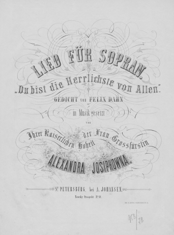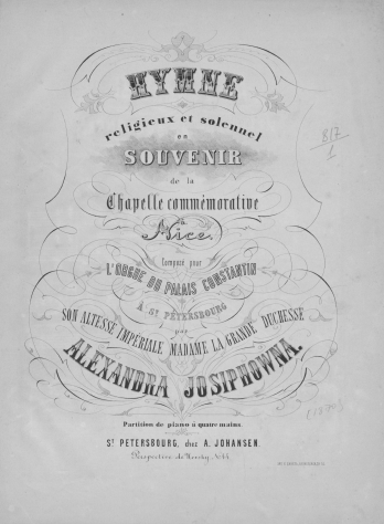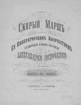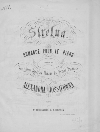 НотыStrelna [Ноты] : romance pour le piano : op. 6 / composée par son altesse impériale, madame la grande duchesse Alexandra JosiphownaАлександра Иосифовна (великая княгиня ; 1830-1911), Композитор [1870-1871]Наличие: Экземпляры доступные для заказа: РНБ (Московский)Шифр хранения: 560-4/531 560-4/531 (1).