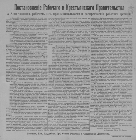 КнигаДекрет о рабочем времени : [листовка]РСФСР. Законы и постановления 1917, нояб.]Наличие: Экземпляры доступные для заказа: РНБ (Садовая)Шифр хранения: ФЛ 2/58 (2).