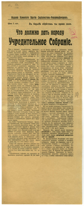 КнигаЧто должно дать народу Учредительное Собрание : [листовка] / Партия социалистов-революционеров[1917, март, после 25 - апрель]Перед текстом: Цена 3 коп. Наличие: Нет доступных экземпляров :