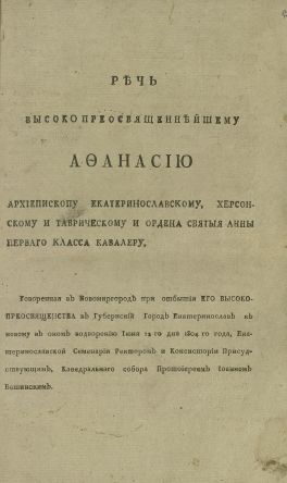 - Говоренная в Новомиргороде при отбытии его высокопреосвященства в губернский город Екатеринослав к новому в оном водворению июня 22-го дня 1804 года, Екатеринославской семинарии ректором и консистории присудствующим, кафедральнаго собора протоиереем Иоанном Башинским (1)