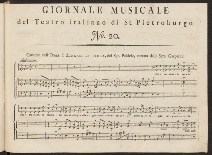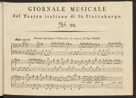НотыGiornale musicale del Teatro italiano di St. Pietroburgo, o scelta d'arie, duetti, terzetti, overturi, etc. delle opere buffe, rappresentate sul Teatro imperiale de St. Pietroburgo, dati in luce ed acomodati per essere accompagnati d'un cembalo solo da Bernardo Theodoro Breitkopf, dilettante: Ноты. Overtura nell'opera "I zingari in fiera" / del sgr. PaisielloПаизиелло, Джованни (1741-1816), Композитор [1796]Сводное описание: Giornale musicale del Teatro italiano di St. Pietroburgo, o scelta d'arie, duetti, terzetti, overturi, etc. delle opere buffe, rappresentate sul Teatro imperiale de St. Pietroburgo, dati in luce ed acomodati per essere accompagnati d'un cembalo solo da Bernardo Theodoro Breitkopf, dilettante: Ноты : [per canto con accompagnato di cembalo, per cembalo solo]Онлайн доступ:Электронная копия Наличие: